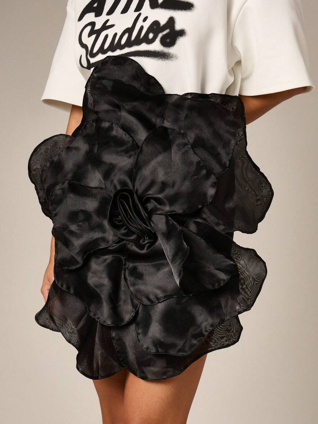 AiiRZ Women's Black Satin Organza Flower Multiway Top Or Mini Skirt Ruffle Hem Detail Tie Waist Evening Party Dressy Elegant Short Feminine