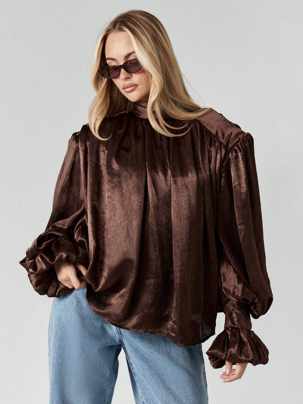 MISSGUIDED Chocolate Satin Volume Top With Wide Leg Pants