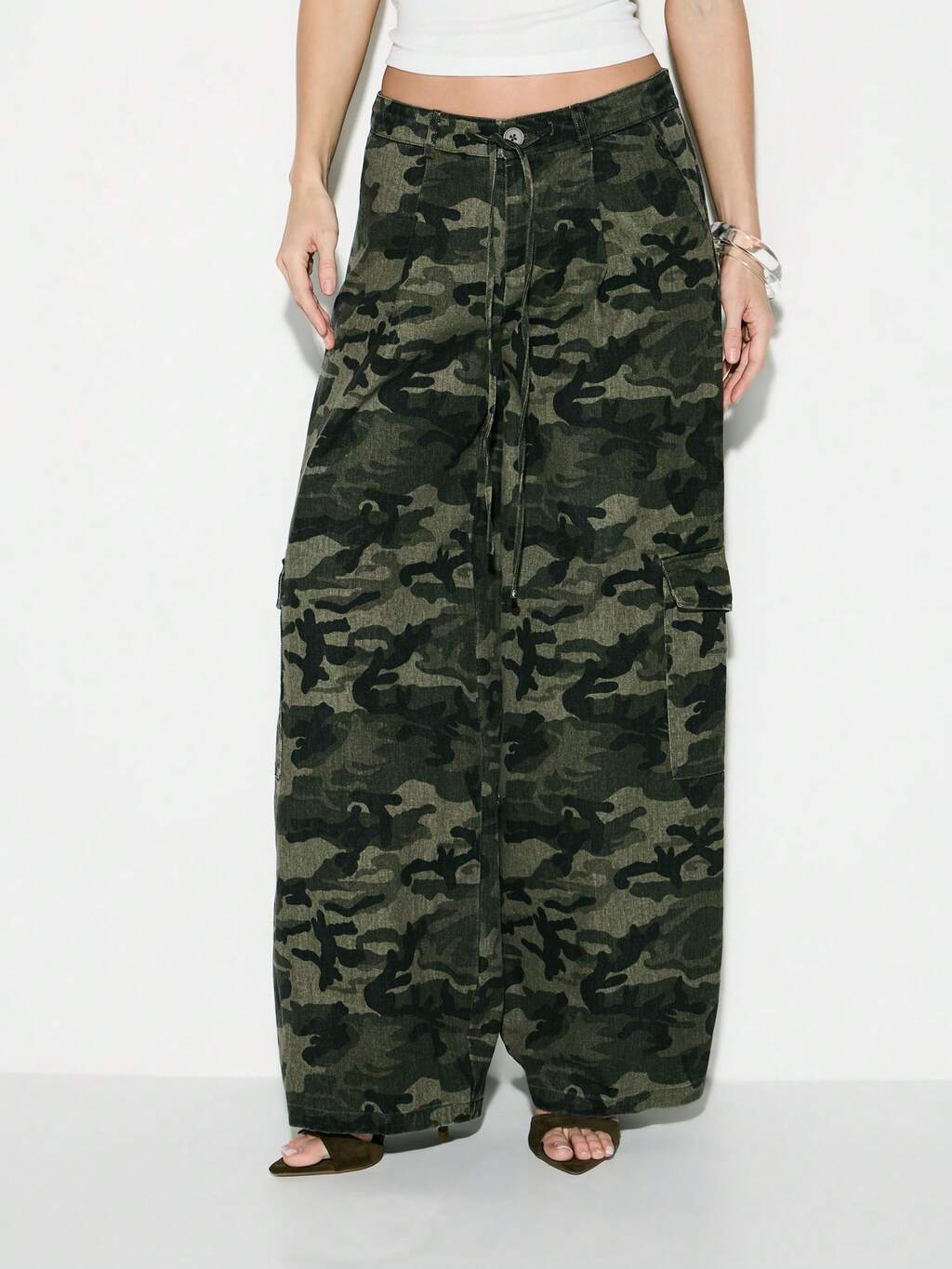 KIZN Army Camouflage Wide Leg Cargo Pants For Women Military Print High Waisted Palazzo Trousers